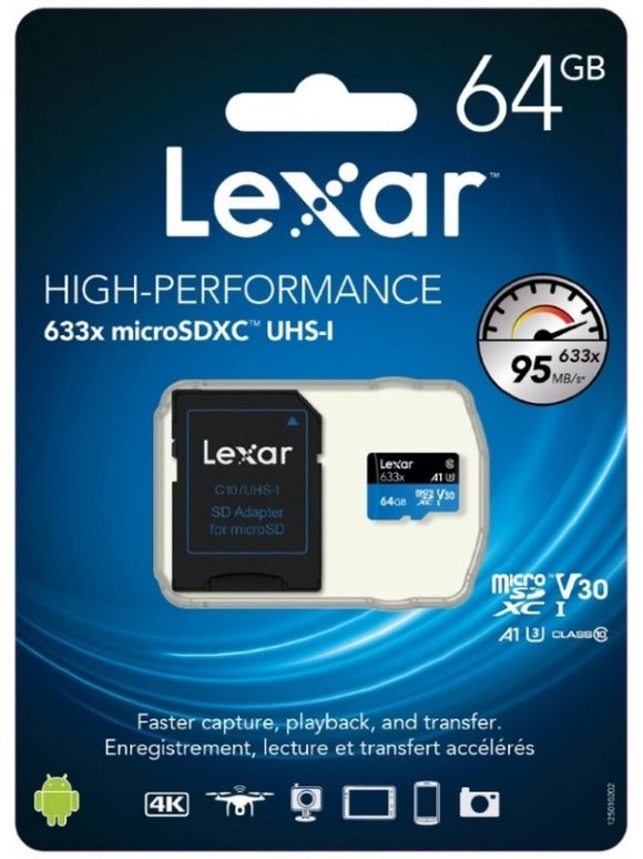 Lexar High Performance 633x 64GB microSDXC UHS-I Card - Upto 95MB/s U3 C10 V30